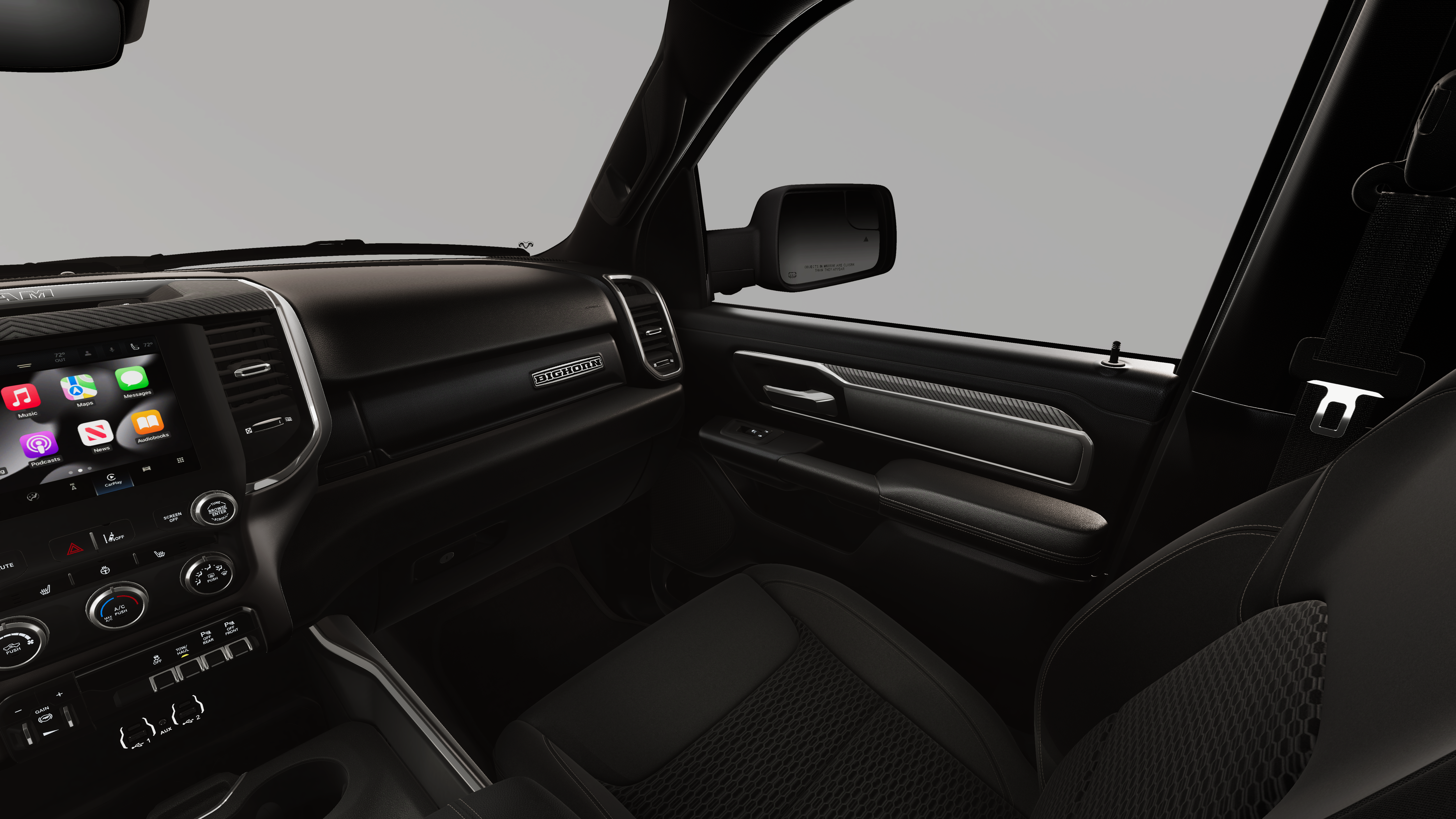 QUICK ORDER PACKAGE 27Z BIG HORN -inc: Engine: 5.7L V8 HEMI MDS VVT eTorque, Transmission: 8-Speed Automatic (8HP75) , TIRES: 275/55R20 OWL ALL SEASON -inc: Bridgestone Brand Tires, REAR WHEELHOUSE LINERS, NIGHT EDITION -inc: Tires: 275/55R20 OWL All Season, Bridgestone Brand Tires, Accent Color Premium Power Mirrors, Exterior Mirrors w/Supplemental Signals, Black Headlamp Bezels, Exterior Mirrors Courtesy Lamps, Grille Black Surround Black Mesh, Auto Power-Folding Mirrors, Wheels: 20" x 9.0" Aluminum Painted Clad, Auto Dim Exterior Driver Mirror, Black Exterior Truck Badging, Anti-Spin Differential Rear Axle, Accent Color Door Handles, Accent Color Tailgate Handle, Black Interior Accents, Dual Exhaust w/Black Tips, Body Color Front Bumper, Body Color Rear Bumper w/Step Pads, Black Tail Lamp Bezels, RAM Grille Badge - Black, Black Painted Exterior Mirrors Caps, MYFLEXCARE SERVICE PLAN, GVWR: 7,100 LBS, ENGINE: 5.7L V8 HEMI MDS VVT ETORQUE -inc: Active Noise Control System, Heavy Duty Engine Cooling, Passive Tuned Mass Damper, GVWR: 7,100 lbs, Dual Rear Exhaust w/Bright Tips, G/T Exhaust, 18" Aluminum Spare Wheel, DIAMOND BLACK CRYSTAL PEARLCOAT, BLACK, DELUXE CLOTH BUCKET SEATS -inc: Power Adjust 8-Way Driver Seat, Rear 60/40 Folding Seat, Rear Center Armrest, Front Seat Back Map Pockets, Power 2-Way Driver Lumbar Adjust, BIG HORN LEVEL 1 EQUIPMENT GROUP -inc: SiriusXM Radio Service, Rear Window Defroster, Rear View Auto Dim Mirror, Power Adjustable Pedals, Leather Wrapped Steering Wheel, Rear Power Sliding Window, Rear Dome w/On/Off Switch Lamp, Glove Box Lamp, Auto Power-Folding Mirrors, Auto Dim Exterior Driver Mirror, Heated Front Seats, Heated Steering Wheel, Black Premium Power Mirrors, SiriusXM Satellite Radio, 400W Inverter, Exterior Mirrors w/Supplemental Signals, Steering Wheel Mounted Audio Controls, Exterior Mirrors Courtesy Lamps, Body Color Fender Flares, 115V Auxiliary Power Outlet, Universal Garage Door Opener, 2nd Row In Floor Storage Bins, Sun Visors w/Illuminated Vanity Mirrors.